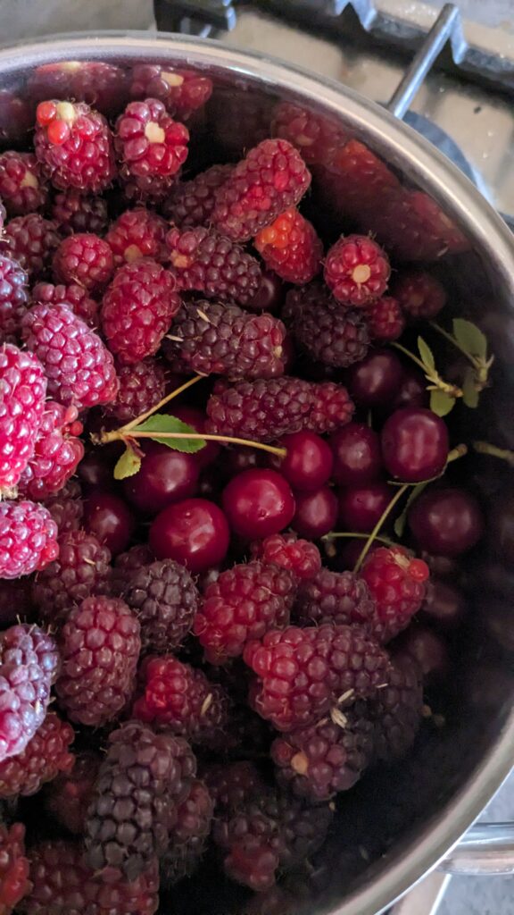 Gemüse und Obst aus dem eigenen Bio-Garten, Naturwein, Fleisch aus eigener Tierhaltung, zeitweise frische Ziegenmilch und -käse sowie Muscheln und Fisch aus der Ostsee